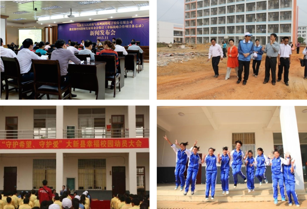 2013年底,应广西大新县政府邀请,基金会开始到位于中越边陲的民族希望中学进行幸福校园建设。学校是县里最偏僻落后的一所中学,学生大多是留守儿童。基金会每年都会派志愿者到学校,为师生们进行师德和生德培训,学习中华孝道,引导孩子们开展“环保爱地球”活动、关注社会弱势群体,开展“敬老院关怀”活动。志愿者和同学们一起打扫校园的每一个角落,在整洁明亮的美好环境里,学生们不断接受正能量的熏陶。孝道教育使孩子们明白了父母、老师的恩德,懂得了孝亲尊师,感恩逐渐成为幸福校园的校风。面对父母外出打工的现实,孩子们学会了承担,将抱怨转化为理解、感恩、前行的动力。到2017年该校的升学率从全县最差变成了全县。覃校长的妻子这样描述校长和学校的变化:“自他从苏州回来,就戒烟改脾气,性格都改变了;好几对老师夫妇家庭关系更和谐了,夫妻都争当班主任,争当留守儿童的另一对爸妈;从希望中学走出的都是懂得体谅父母的好孩子,到高中仍备受好评的好学生”。