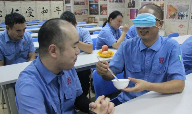 师徒互动小游戏:蒙眼喂花生。每一次共有三组师徒参加。每组的小碗中放8颗花生,徒弟蒙眼使用筷子夹起花生喂师傅,最先吃完用时最短的一组为获胜方。游戏现场,家人们乐在其中,笑声不断。