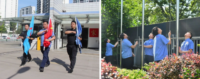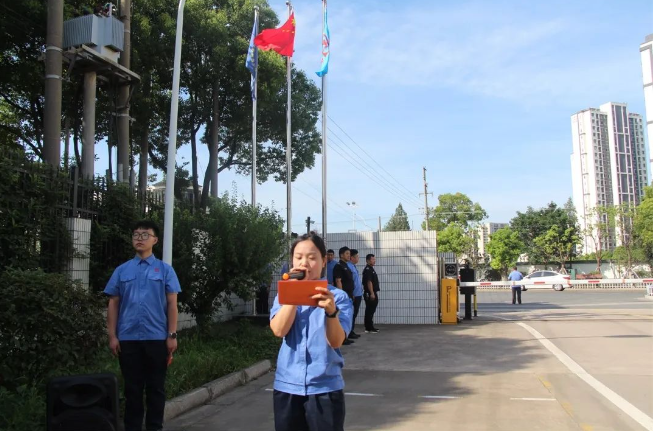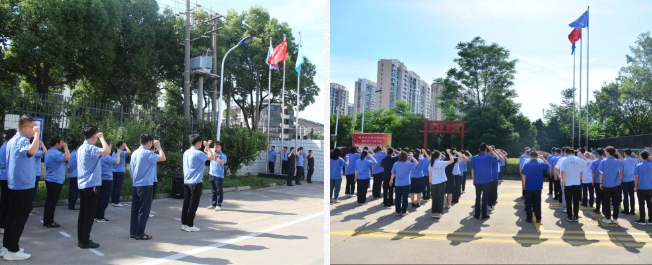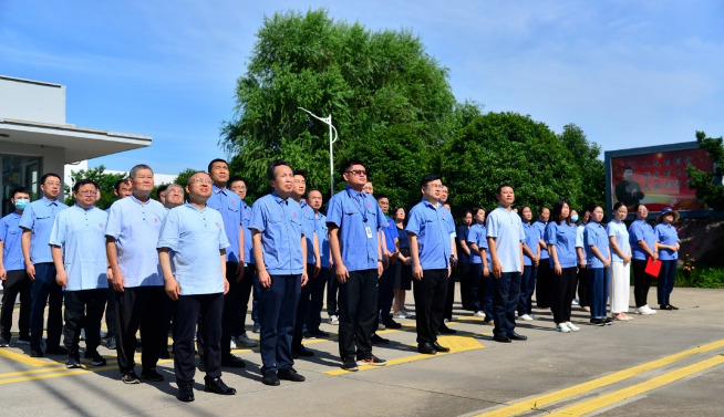6月28日,迎着清晨的朝阳,各部门家人在总厂及IC厂门卫集合,举行庄严而又隆重的升国旗仪式。