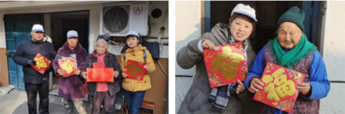 献上一份新春慰问,传承尊老、敬老的社会担当。贴窗花、送“福”字,以实际行动点亮爱心,传递慈善力量。让我们满载健康的期待、幸福的向往,用新春“祝福”装扮家园,温暖过冬天,开心迎新年!
