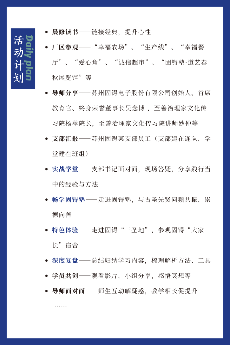 展望2024 四大升级- 两日研学 -升级一- 实战学堂 -邀请固锝优秀的“家文化”支部书记代表、至善治理改善“作战室”一线人员分享剖析“八大模块”落地心法与工具,助力学长夯实方法论、工具论,结合企业自身实际情况,发现问题、分析问题、解决问题。