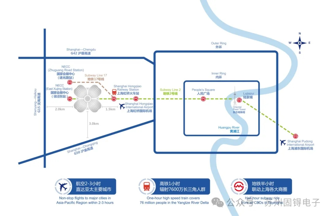 展会与虹桥交通枢纽的直线距离仅1.5公里,通过地铁与虹桥高铁站、虹桥机场紧密相连。周边高速公路网络四通八达,交通十分便利。
