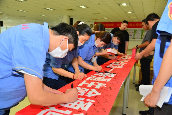 家人们走进幸福餐厅,参加EHS组织的安全生产月签名活动,一个个签名,是员工在心中立下的承诺,是大家履行人人讲安全、个个会应急——畅通生命通道的决心。