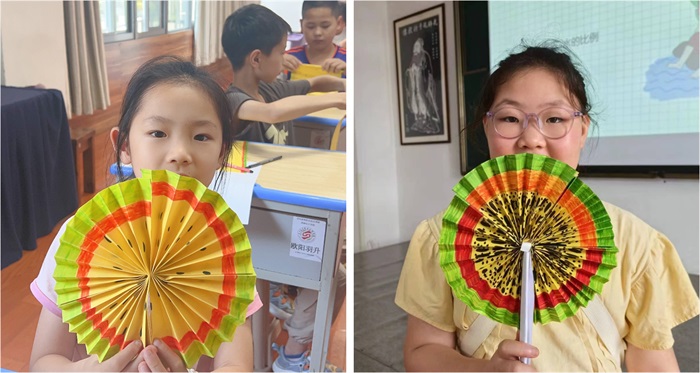 不远处传来的童声,把我们吸引到多姿多彩的手工课现场。孩子们在老师的声声鼓励中,点燃了DIY折扇的热情,不一会儿,一把把带有夏天味道的“西瓜扇”就呈现在大家的眼前。