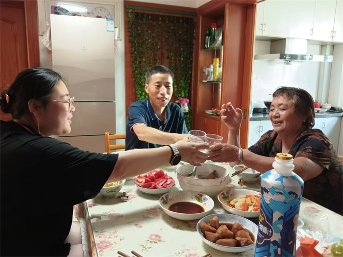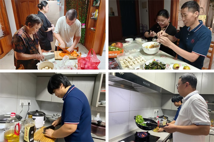 “阿姨我们来看您来了,最近身体还好吧!”“蛮好啊!蛮好啊!”阿姨用苏州方言回答,显得中气十足。阿姨想让大家坐下来歇歇,但家人们干劲儿十足,马上开始摘菜、洗菜、切菜;哗啦哗啦、喀嚓喀嚓、铿里框朗。不一会儿,香气扑鼻的水饺或菜肴已经上桌。
