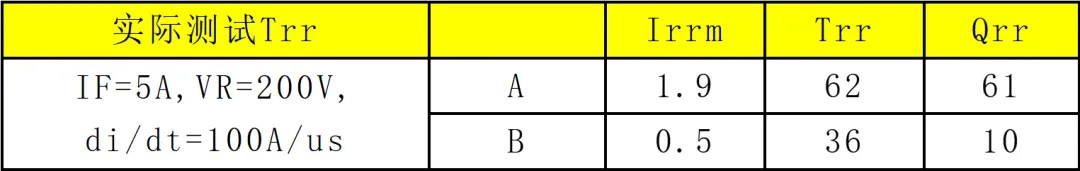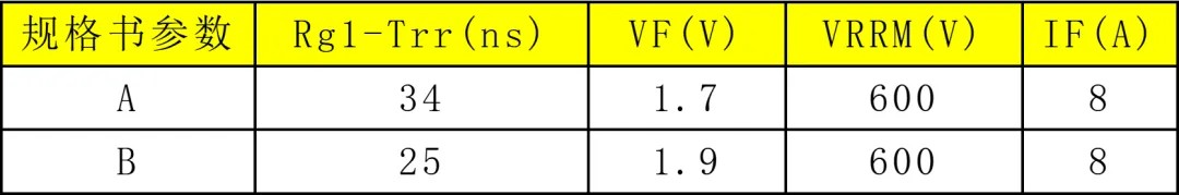 如下两颗FRD具有相同的电流电压规格,Trr差异较小,但是反向恢复损耗却相差较大,在高温条件下,差距会进一步放大, 由此带来的功耗差异也不能忽略。