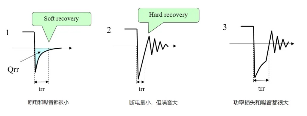 恢复电流恢复太突然时,它会产生更多的噪音. 因此,trr不仅要小,而且需要较缓的恢复。下面数字1和3在规格中可能看起来具有相同的trr,但损耗和噪音都大不相同。此外,2号在查看规格时看起来非常好,但它会产生很大的噪音。