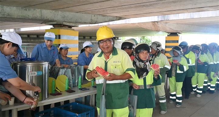 为了向这些城市美容师表达谢意,在酷暑来临之际,志愿者们怀着满满的爱心来到通安镇环卫工人临时集合点。到达后,大家立即分工协作:有人仔细摆放清凉物资,像准备珍贵礼物般认真;有人熟练地切着西瓜,精心倒好酸梅汤,专注的神情仿佛在完成一件艺术品。
