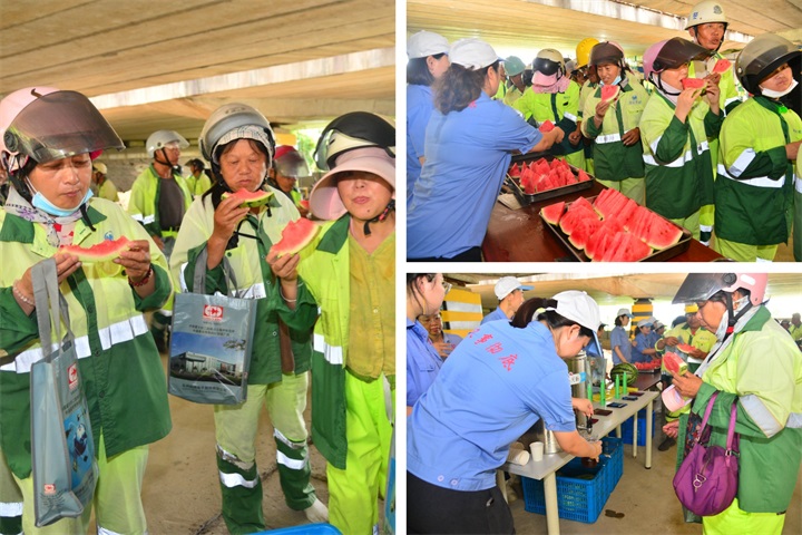 中午11点,烈日当空,完成清扫工作的环卫工人们陆续归来。虽然脸上带着疲惫,但更多的是对工作的执着。志愿者们立即迎上前,将清凉饮品、爽口西瓜等防暑物资一一送上。
