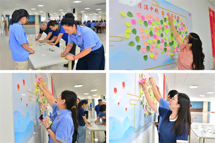 “书写祝福”区则是一片安静温柔。家人们俯身提笔,写下“中秋快乐”“万事顺意”……一句句简单祝福,承载着最真挚的心愿。纸短情长,每一笔都是团圆的味道。